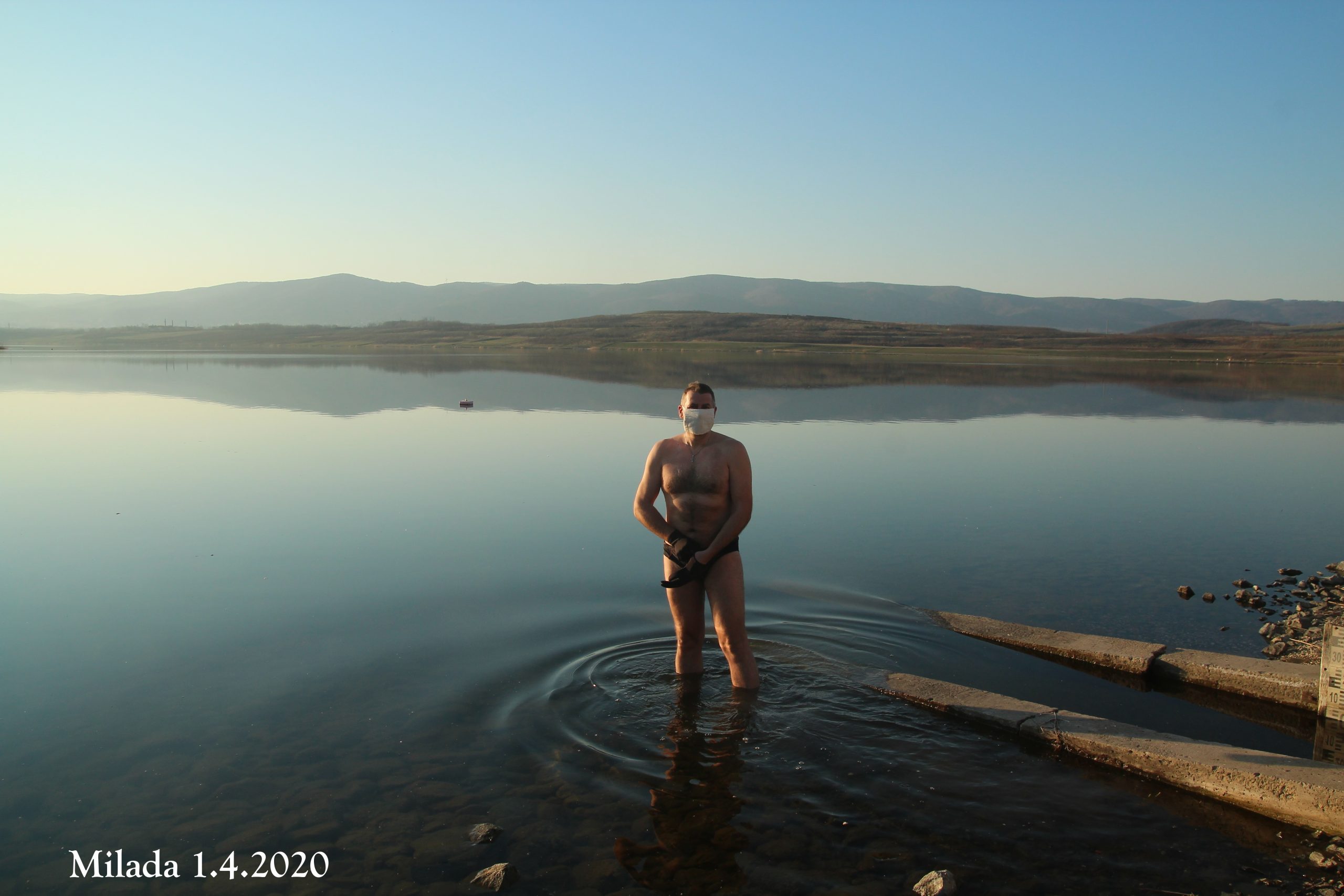 Nejvíc nám však chybí ta úžasná parta, s kterou jsme se od září setkávali už pátou sezónu. Proto se těch 6 nejpoctivějších, co nevynechávali chodit po celou sezónu 2x v týdnu, sešlo 1. Apríl s rouškami a v patřičných rozestupech, dle nařízení, aby si připomněli ty krásné okamžiky. My 4, Honza, Ruda, Jirka a já, se ponořili do průzračné vody Milady už v 16 hodin, za krásného slunečného odpoledne. Ota, který s námi taky pravidelně chodil je po operaci, ale taky se mu už po nás stýskalo, a tak nás přišel aspoň vyfotit. Já jsem si počkal ne půl sedmou, kdy jsme se pravidelně setkávali, ale přišel bohužel jen Martin, ale nelitoval jsem, protože kromě něho jsem si vyfotil krásný západ slunce, který je na Miladě nádherný a nikdy se neokouká. My otužilci jsme stále ještě, díky klíči, který nám víla Milada předala stále vládci nad Jezerem, a letos jimi asi zůstaneme, nebo ho předáme virtuálně?